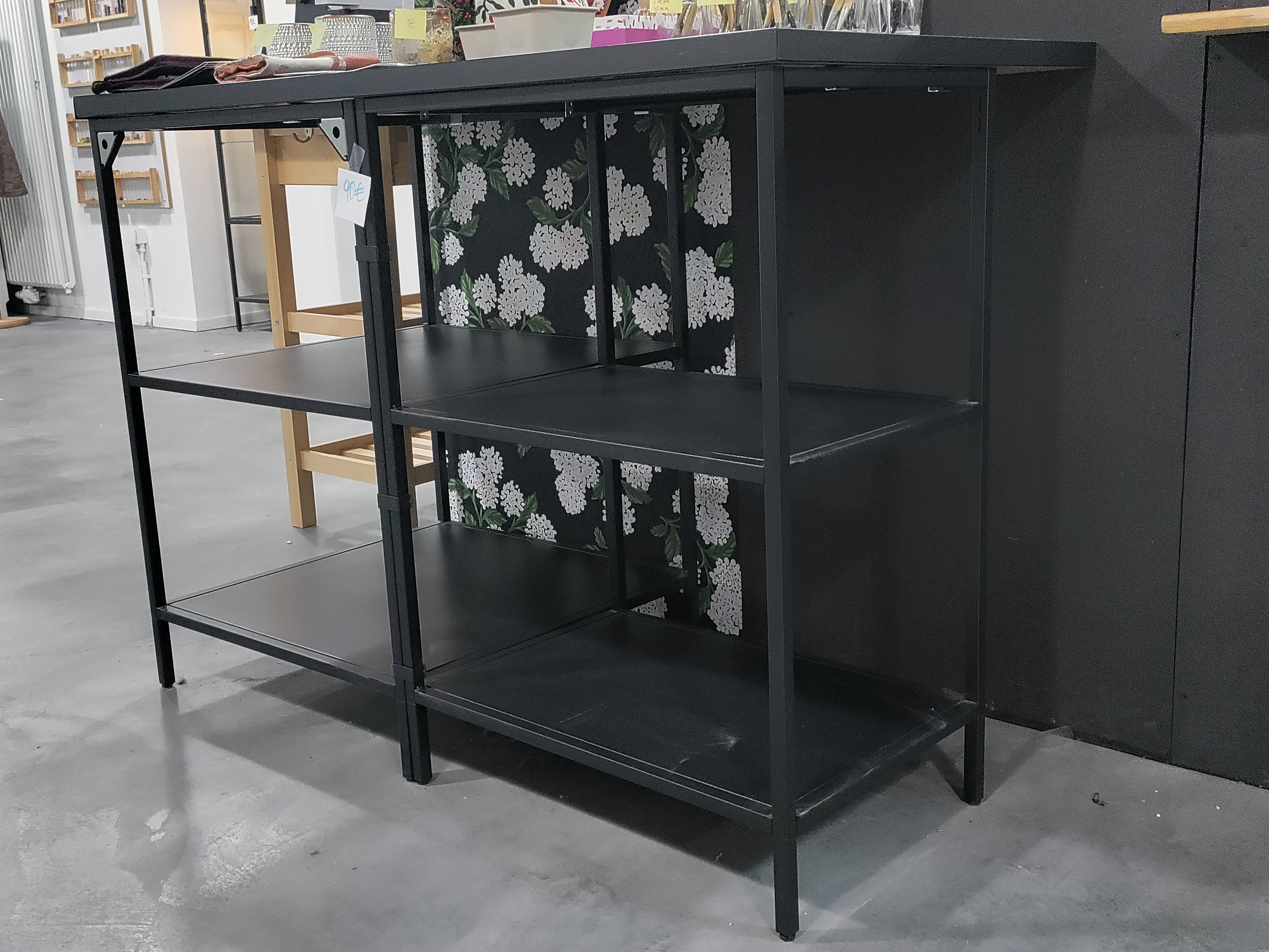 Ce meuble de seconde main en bon état général est composé de deux structures ENHET de chez Ikea (Une de 60x60x75cm à 65€ neuve et une autre de 40x60x75 à 55€ neuve) qui ont été assemblées et sur lesquelles nous avons ajouté  une plaque noire découpée sur mesure.