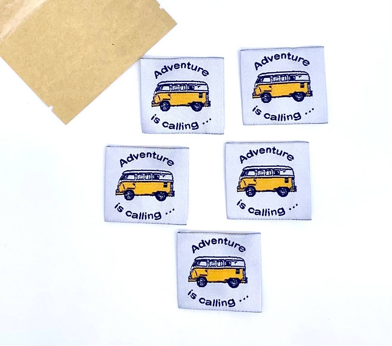 Étiquettes tissées avec l'inscription "ADVENTURE IS CALLING" à coudre sur les vêtements.