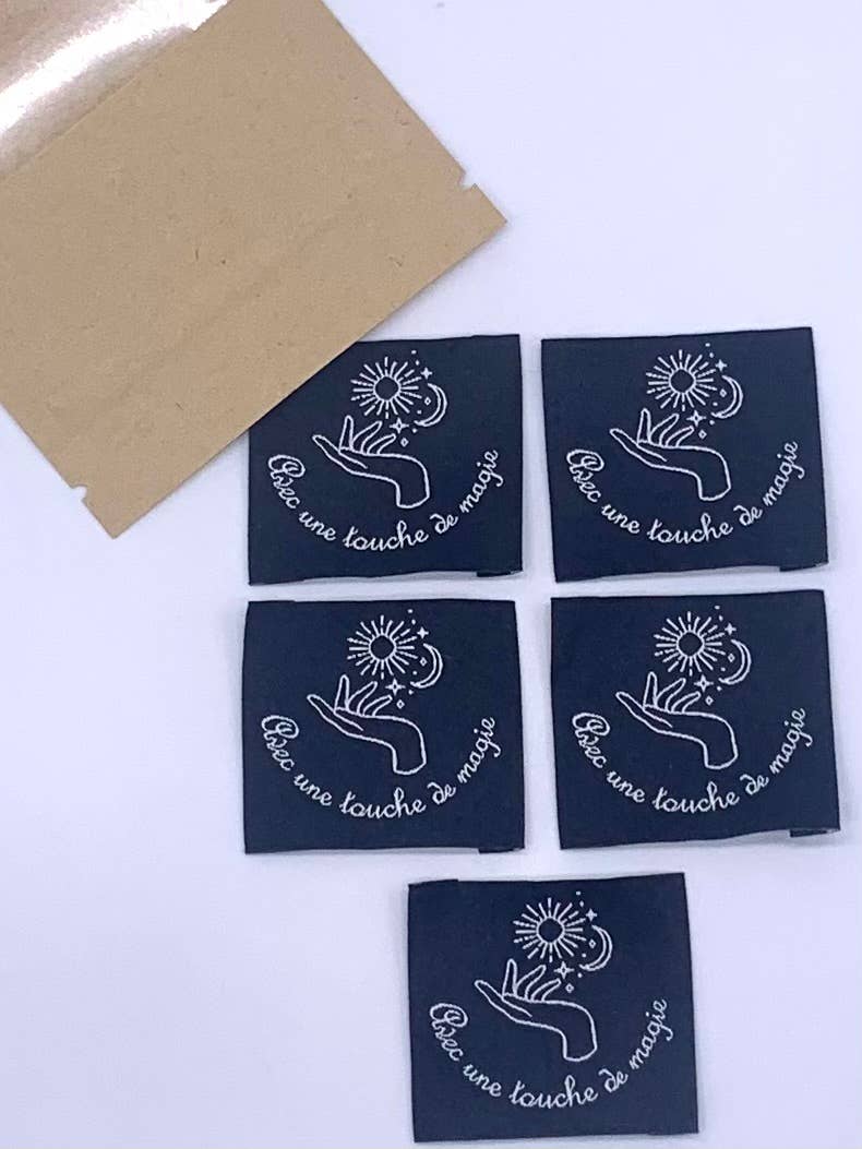 Étiquettes tissées de couleur noir avec l'inscription "AVEC UNE TOUCHE DE MAGIE" à coudre sur les vêtements.