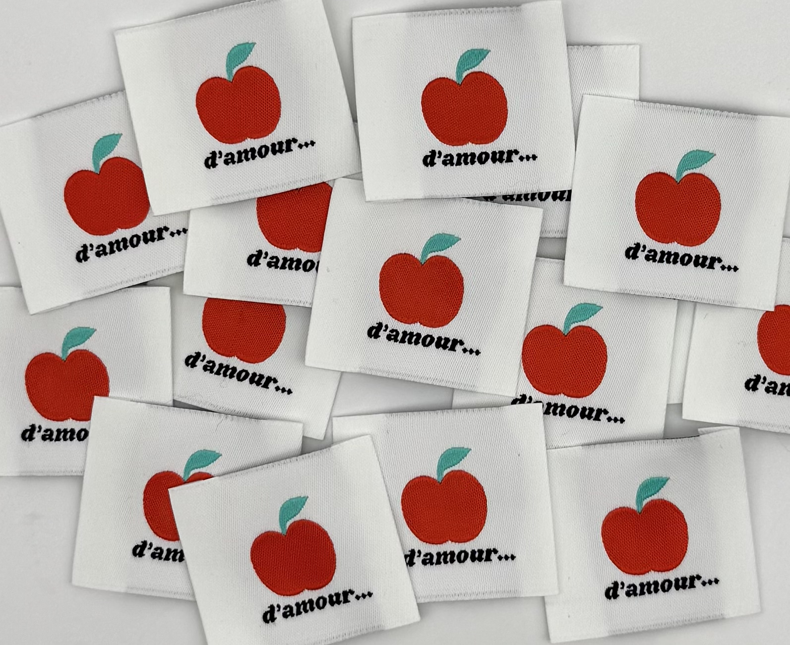 Étiquettes tissées avec l'inscription "POMME D'AMOUR" à coudre sur les vêtements.