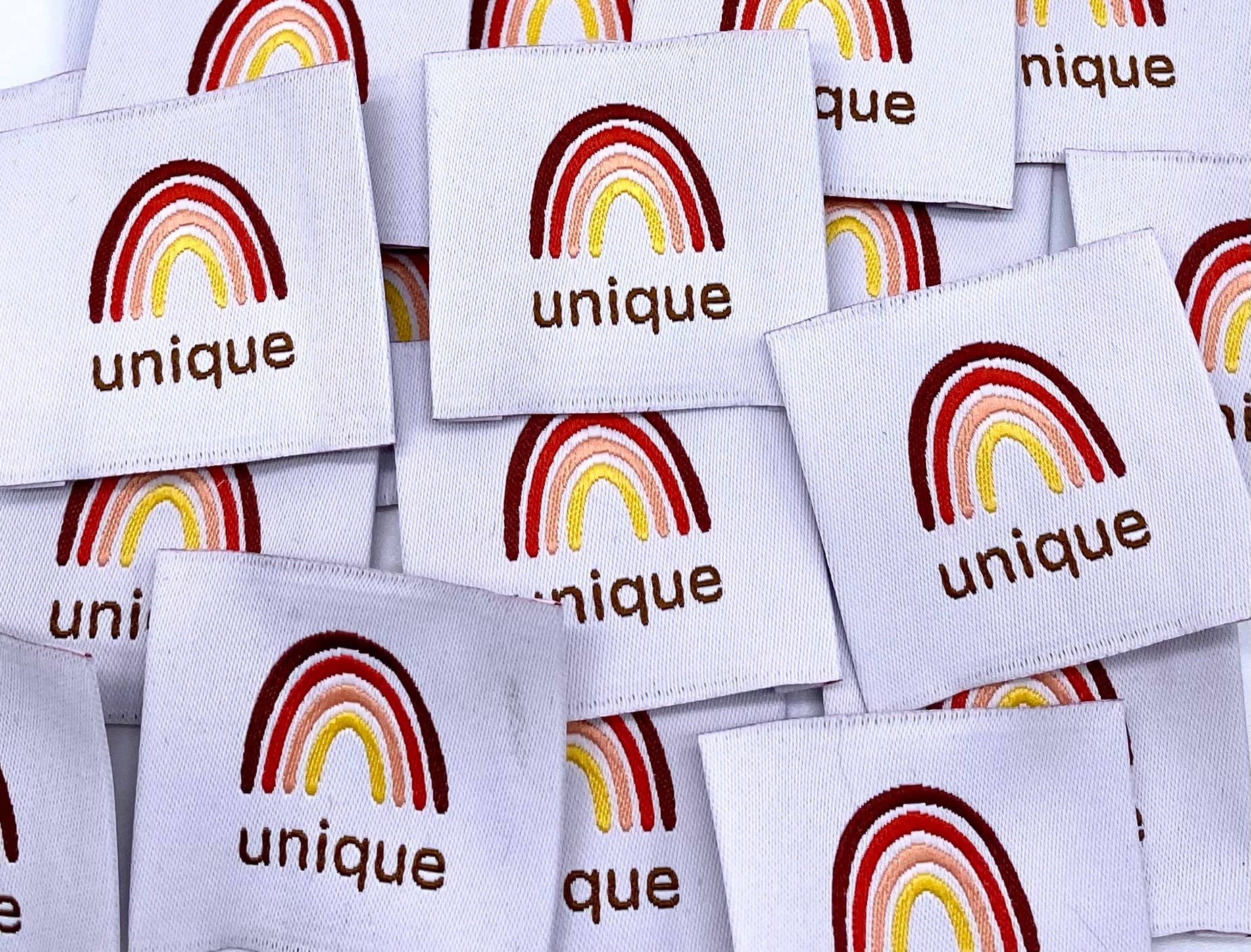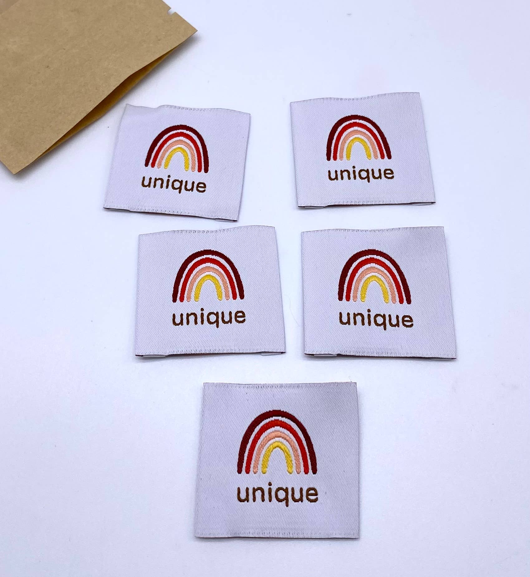 Étiquettes tissées avec l'inscription "UNIQUE" et un arc en ciel aux couleurs chaudes à coudre sur les vêtements.