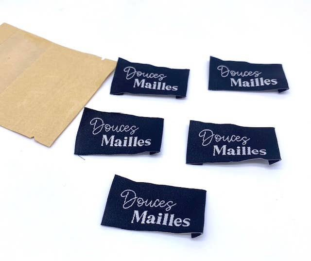 Étiquettes tissées avec l'inscription "Douces Mailles" à coudre sur les vêtements.