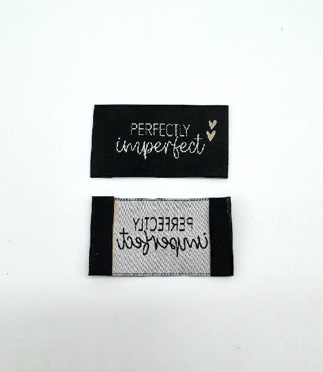 Étiquettes tissées de couleurs noir, blanc et rose pâle avec l'inscription "perfectly imperfect" à coudre sur les vêtements.